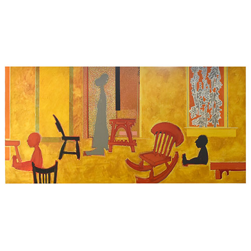 An example of this can be seen in the studies by artist Alan Weinstein that are part of the collection at the Bruce County Museum & Cultural Centre. These studies were used for the large-scale painting titled ‘Interior’. The initial study used black and the three primary colours to map out the figures and shapes. The use of light and dark helps to visualize how the composition flows. The pencil sketch study shows a more detailed layout by the artist and more intentional mark making of figures and shape placement. There are still some recognizable aspects to the study in the final piece, but you can also see how the artist took out some details. Creating these smaller scale studies would have allowed the artist to understand the flow of the composition. These studies were the starting point before transferring his vision to a large 6 x 12 foot painting which was in progress from 1996-2000.