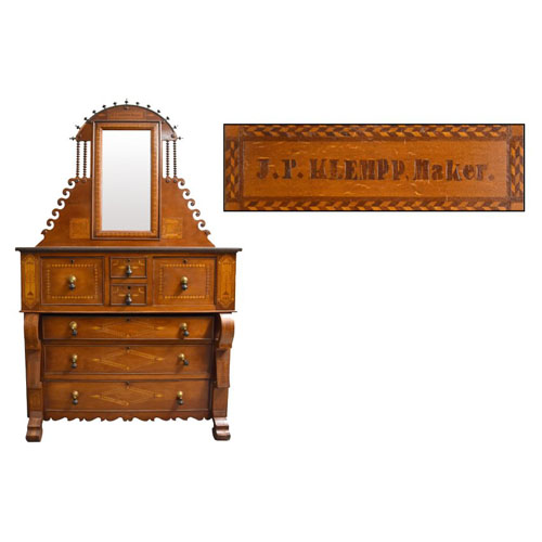 One bonnet chest was made by John P. Klempp. Born in 1852, Klempp, was a cabinet maker who came to the area in the late 1860s, and settled in Carlsruhe. Though by 1880 Klempp had given up his trade, and operated a hotel in Neustadt, and later one in Walkerton, he continued to make furniture for his family. It is not known who this piece was made for, or when it was made, but it was passed down through members of the Klempp family and bears his name as maker.