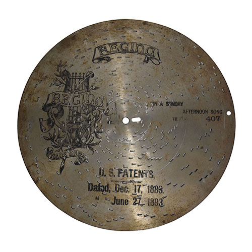 Regina music boxes made their way onto the market in the 1890s. Unlike the Gem Roller Organ that used cobs, Regina music boxes used perforated metal discs which were rolled over a soundboard. The perforations in the discs engage the teeth of a gear and as the gear spins it plucks the tine of a musical comb. Each tine of the comb is tuned to a precise musical pitch. Regina music boxes were renowned for their rich tone as they used two combs. There were several models of music boxes, including tabletop sized to floor models. The discs ranged in size from 8.5 to 27 inches in diameter.