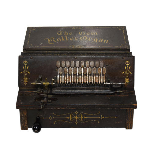 The Gem Roller Organ was manufactured under that name by a variety of companies, including Sears & Roebuck, and was the middle-class affordable alternative to a parlour organ. In 1902, Sear & Roebuck sold Gem Roller Organs for $3.25 and there were many musical cobs to choose from. Roller organs used cobs which are wooden cylinders with steel pins, set to play 20 notes. When the pins roll over the valve keys, they produce a song. The roller organ within the collection dates from the turn of the 20th century.