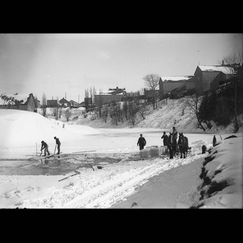 In the earlier days there would be a group of men with a team of horses and sleighs. Each would have the task to either cut the blocks, fish them in the open water and move towards the loading platforms, or physically lift the blocks and stack them for transporting and storage. By the late 1920’s, motorized cutting machines made the process faster and were able to produce large quantities of ice. A power saw could cut up to 3,000 blocks a day.