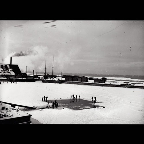 Scougall, John H. Cutting ice blocks in Kincardine harbour [Photograph]. 1874-1922. John. H. Scougall Fonds. A992.022.0957, Bruce County Museum & Cultural Centre