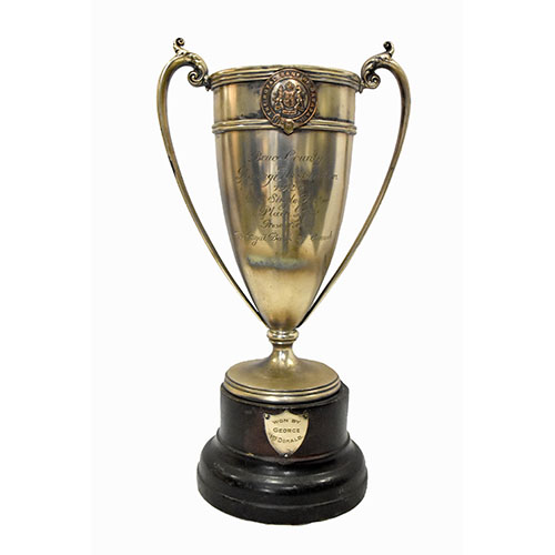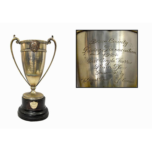 Alexander’s son, George, was the next to inherit the plough. George, his wife Erma Shiells, along with his brother Murray, stayed on the north half of Lot 57, Concession 1 and continued to operate the farm, which was known as ‘Spruce Nook Farm’. As Spruce Nook, they raised registered Shorthorn cattle and Yorkshire pigs. Spruce Nook Farm was sold in 1962. In 1959, just prior to selling the farm, George moved to Ripley and was the shipper at U.C.O for sixteen years before retiring and opening McDonald Antiques which he operated until his death in 1982. George also used the plough during matches and used it at the first Bruce County Plowing Match which took place north of Paisley on Watson McKinnon’s farm October 21, 1924. George won first prize in Class 3, (18-25 years of age), at the age of 19, and best finish. He was also awarded a silver cup, valued at $25, donated by the Royal Bank, for best ridge in Classes 2 (open to all who have never won a men’s prize), and 3. This trophy engraved with “best single furrow – plain plow” is also part of the museum’s collection, and was donated 17 years after the plough. It is interesting to note, George won with the plough the year his grandfather died, and at the time of winning, the plough, thought to have been purchased in ca. 1852, was over 70 years old, nearly four times the age of the operator.