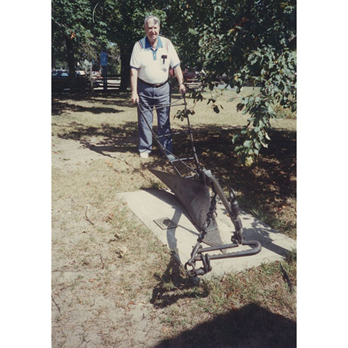 Red Jim’s plough was donated to the museum in 1987 and had always been displayed outdoors – first in front of the museum near the log buildings and then just outside of the log cabin after the 2005 renovation. After its long tenure outside, the plough has been brought indoors, cleaned, and will continue to find a home indoors for future preservation. Found within the plough’s donation file are letters from the donor and other family members expressing their pleasure at being able to see the plough on display. Also found in the file is a letter and this photograph from 1994. The photograph features Andrew, a son of Red Jim (born when Red Jim was 75), at age 86.