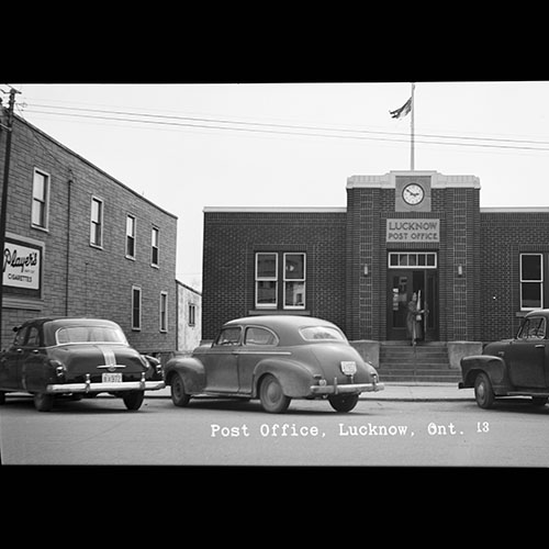 In 1915, the rural mail system was introduced and many small community post offices were closed. This made Lucknow the main post office for the area. The post office changed locations in 1939, and in 1981, a ramp was added to the front for accessibility purposes. This photograph found in the Carol Homuth Fonds, shows the post office at its second location between 1950 and 1970.