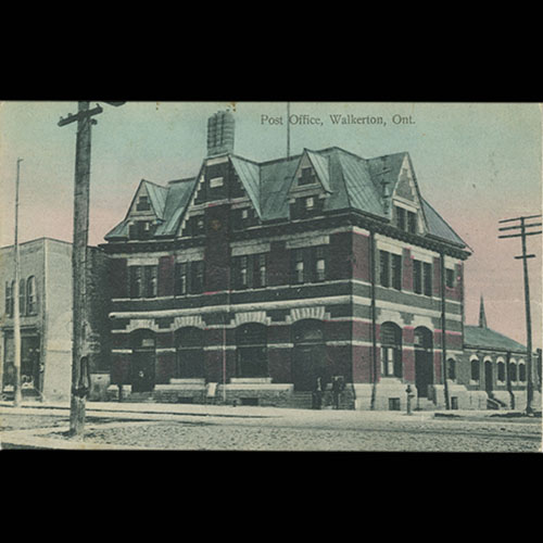 The Brant post office was opened in 1852, and the first postmaster was John Shennan, who was the first store owner in Walkerton. After a year, Shennan relinquished the role of postmaster to Malcolm McLean who had previous post office experience. Mclean held the role for 52 years, until 1905. Mclean for his years of uninterrupted service holds the record for the longest serving postmaster in Ontario, and the second longest in Canada. In 1857, the name of the post office changed to Walkerton. The photo of the Walkerton post office seen here dates between 1905 and 1925.