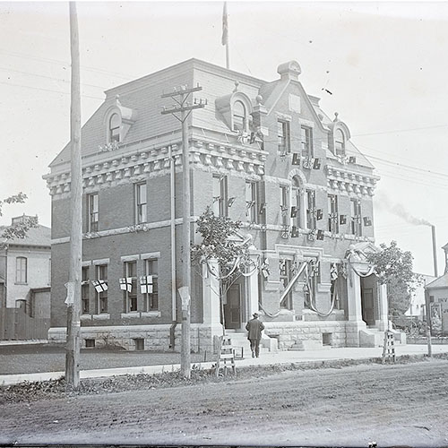 This photo from the Scougall Collection, shows the Kincardine post office decorated with flags and bunting for an event. It dates between 1907 and 1922.