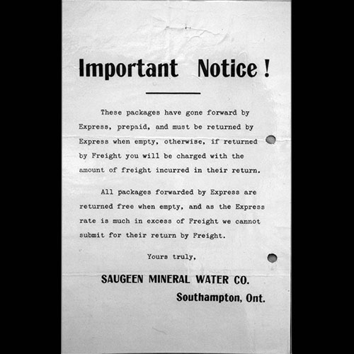 Hilborn, Robin R. “Saugeen Mineral Water Company”. Southampton Vignettes: A brief history of a Lake Huron town. Family Helper, June 2010, A2015.096.001, pg. 71-72, Bruce County Museum & Cultural Centre.