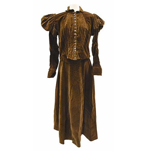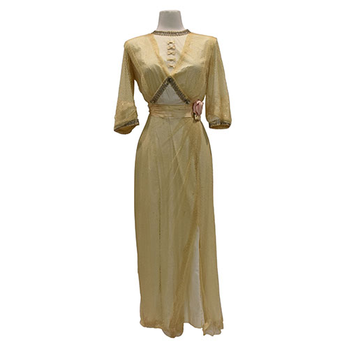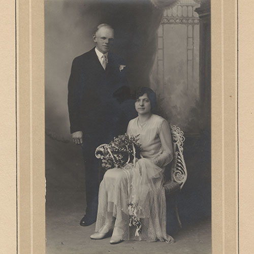 John and Laura were married May 1, 1930, in Walkerton. Both were born and raised in Brant Township. Laura graduated from the Weston School of Nursing in 1928 and is listed as a nurse on her wedding certificate, while John is listed as a farmer. John and Laura farmed in Brant Township near Elmwood and later retired to Hanover. Within the collection are two dresses, one Laura wore on her wedding day, and the other she wore when posing for her wedding photo. The photo of Laura and John is seen here along with the dress worn in the photo.