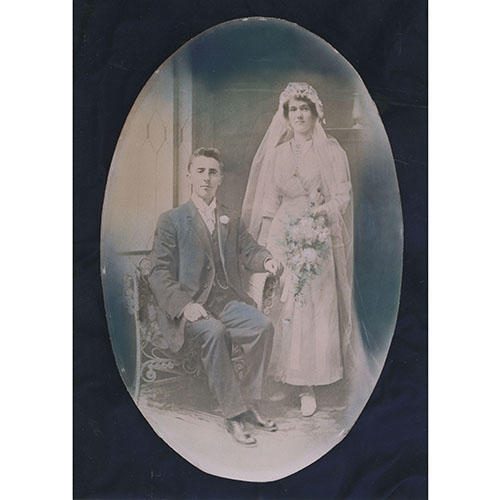 Edward and Laura were married April 24, 1913, in Walkerton. Laura was born and raised in Brant Township, while Edward was born in Bentick Township, Grey County. After their marriage they farmed in Brant Township, where they raised their children. Found in collection is Laura’s wedding dress (seen here), shoes, veil and hair ornaments, and purse used on her wedding day, along with a receipt for having her dress hemmed and their wedding photo.
