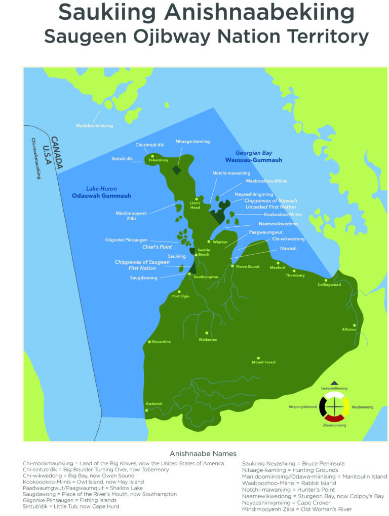 Saugeen First Nation #29 (SFN) is made up of a distinct Anishnaabek Nation. They are comprised of the Three Fires Confederacy. They are located on the Lake Huron side of the Peninsula just North of Southampton.