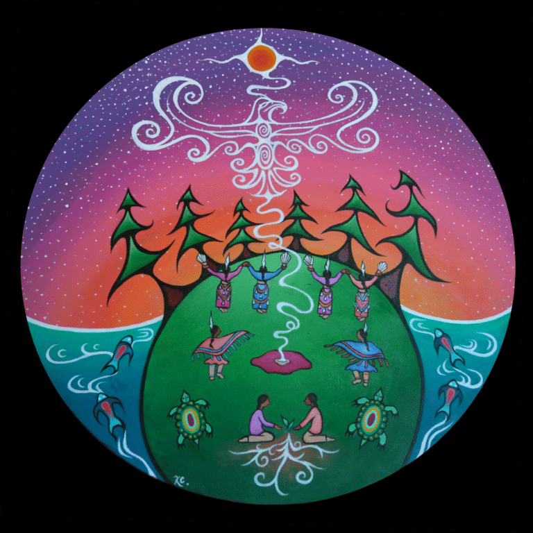 This painting symbolizes the connection that Anishinaabe people share with the land, and with that and Anishinaabe way of acknowledging the land, the ancestors, and the responsibility we carry forward. Centered in ceremony and connections, the imagery reflects our relationship to all living beings. Those who